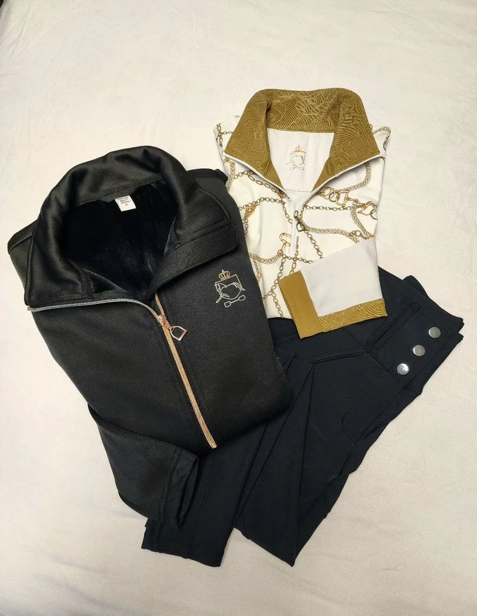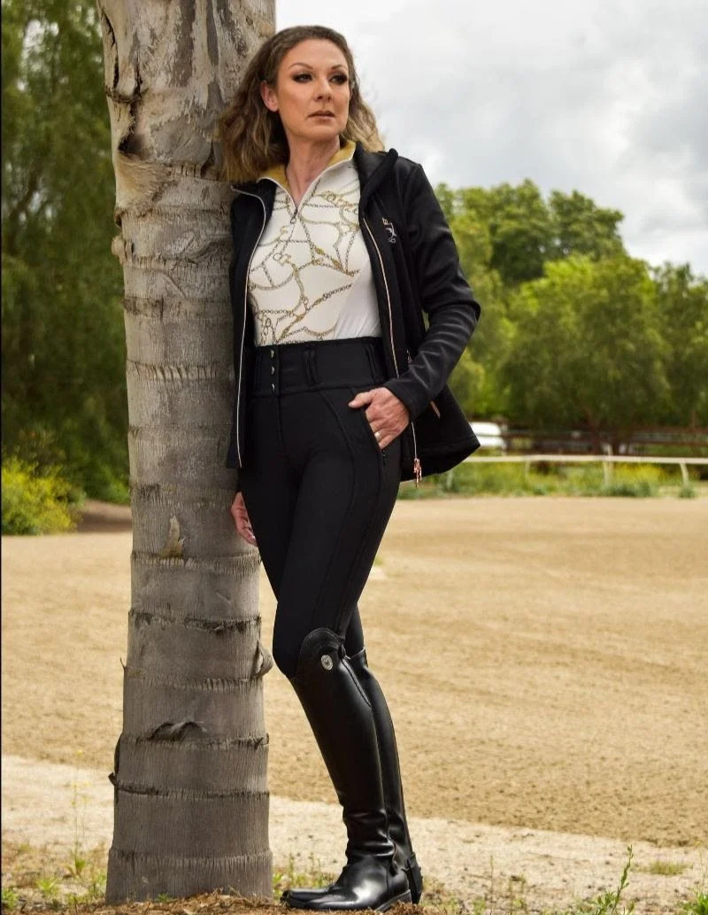 Luxuriate in the high-quality materials of Dressage Queen Dream's designs: a beautifully crafted pair of Advanced Rider breeches for the perfect independent seat, a silhouette enhancing riding shirt made of 80% recycled material with rose mesh lace embellishments, and a super soft velvet-lined jacket that will make you all feel like a Queen.