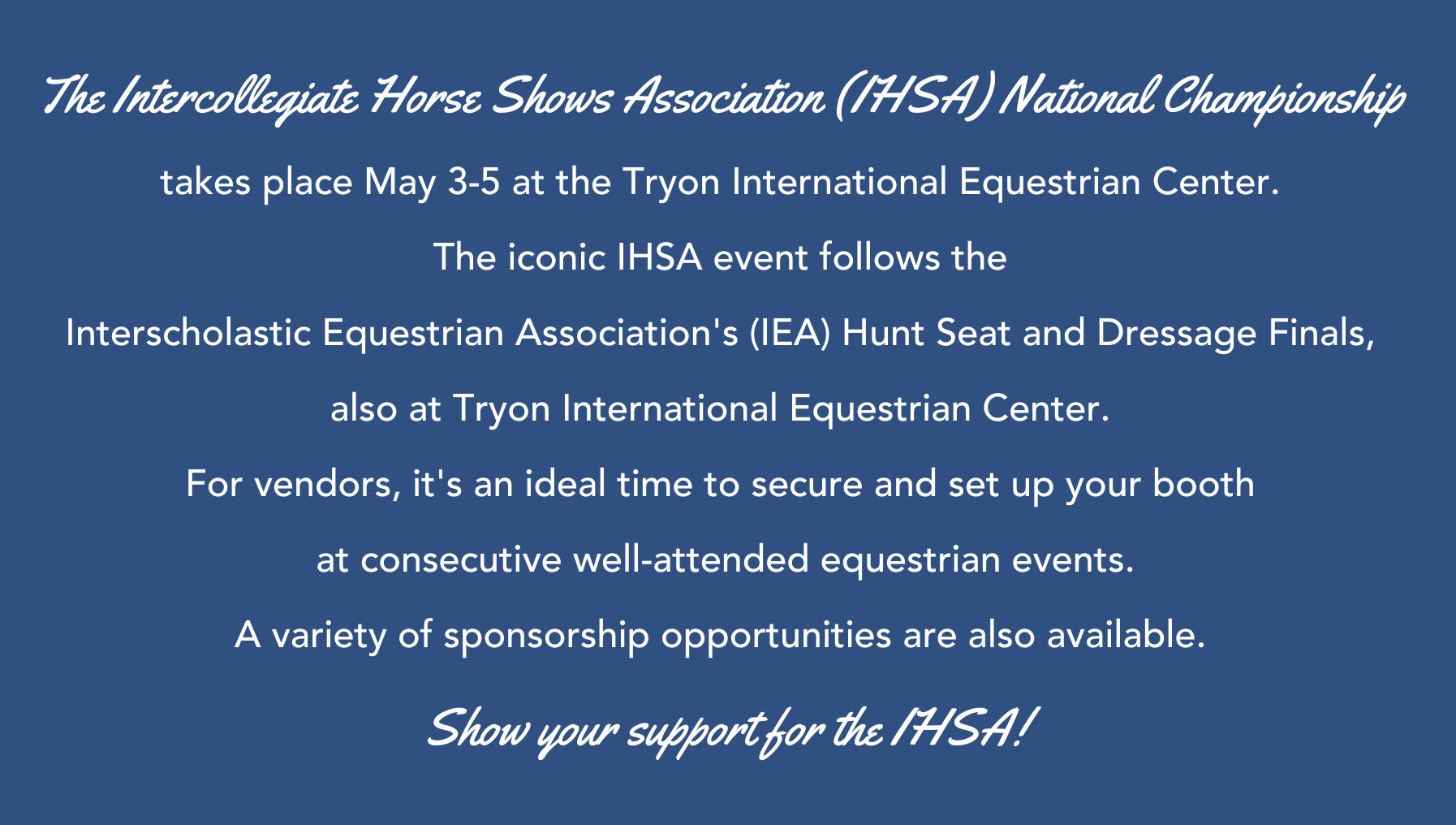Reserve Your Vendor Booth at the IHSA National Championship Feb 7 Written By Carrie Wirth Reserve Your Vendor Booth at the IHSA National Championship Learn More About Sponsorship and Vendor Booths Purchase Vendor Booths and Sponsorship Carrie Wirth