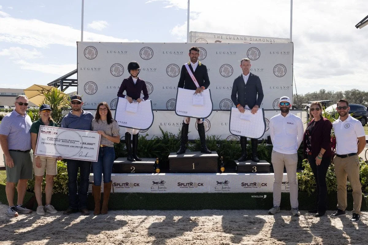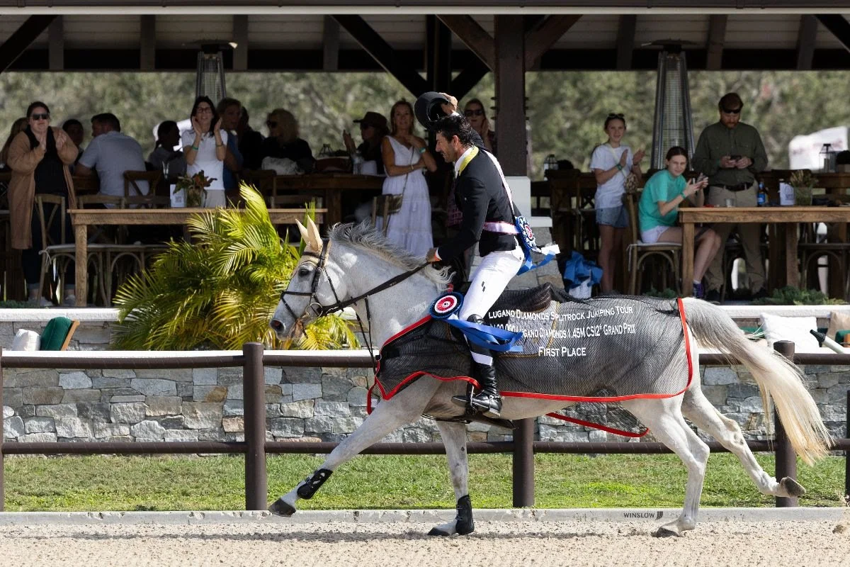 Myakka City, Fla. – Jan. 27, 2024 – The Lugano Diamonds Split Rock Jumping Tour’s (SRJT) $100,000 Lugano Diamonds 1.45m Grand Prix took place before an atmospheric crowd on Saturday afternoon at the world-class TerraNova Equestrian Center. Ultimately, it was Rowan Willis (AUS) and his own homebred 13-year-old warmblood mare, Wellington Grey Goose (Corlensky G x Grandira), who stood atop the podium after dominating the jump off.