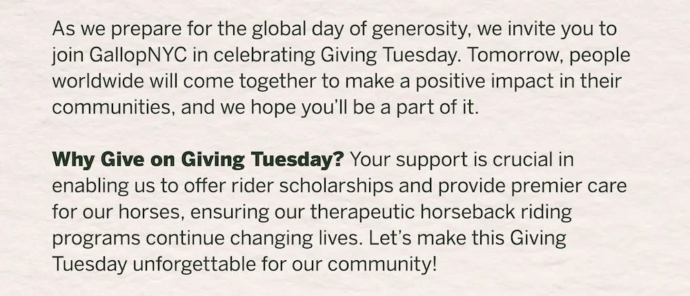 Tomorrow is Giving Tuesday: Help Support GallopNYC Nov 27 Written By Carrie Wirth Donate Now Carrie Wirth